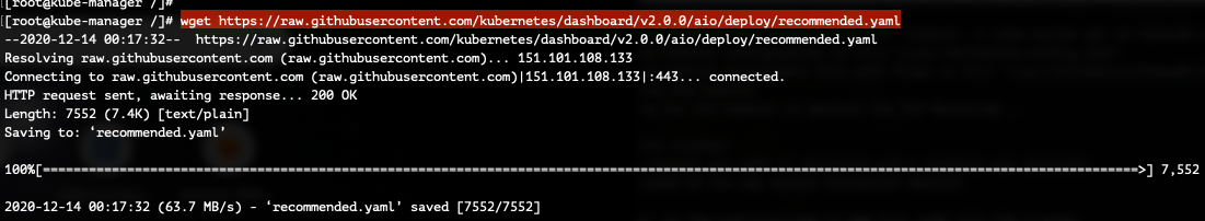 [root@kube-manager /]# wget https://raw.githubusercontent.com/kubernetes/dashboard/v2.0.0/aio/deploy/recommended.yaml