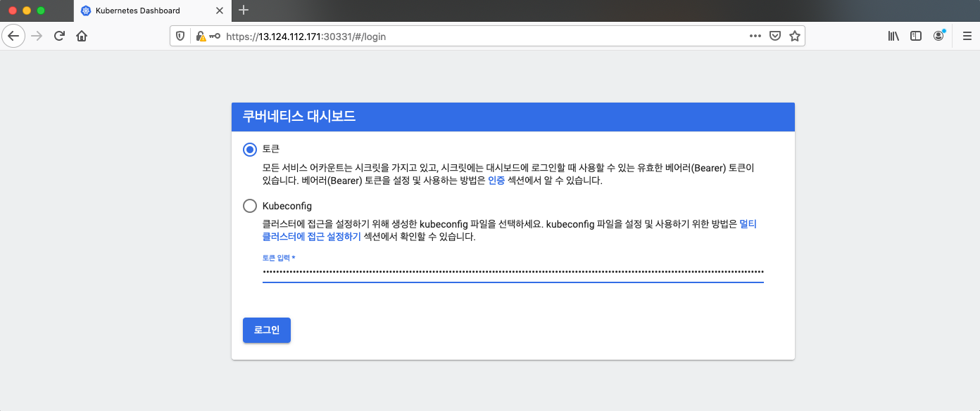쿠버네티스 대시보드 로그인 페이지가 나왔네요!