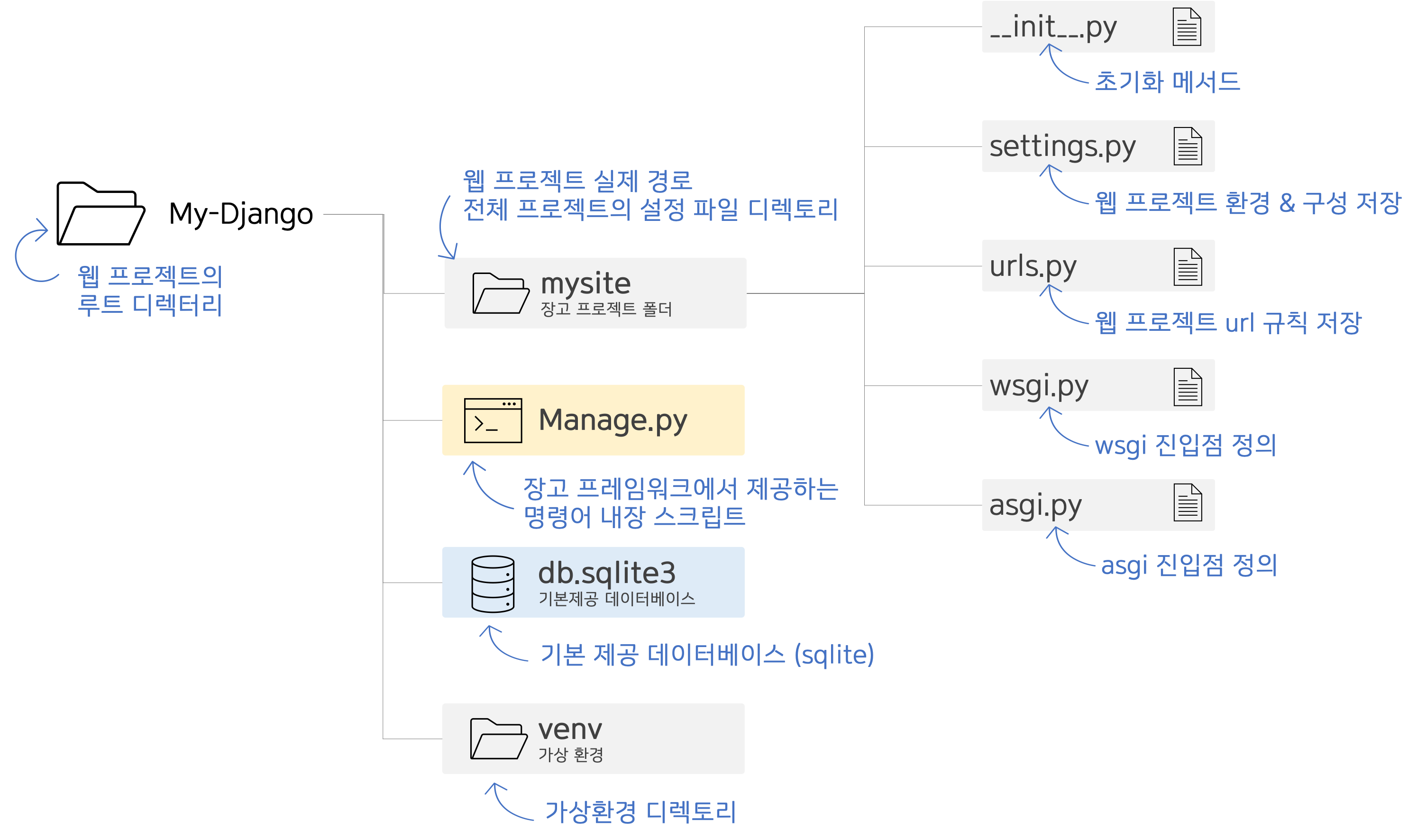 Django Web Project를 만드는 이번 단계까지 마무리 했다면 디렉토리는 이렇게 구성되었을 것입니다.