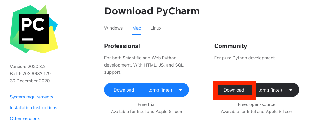 파이참을 설치하기위해 공식 홈페이지에 접속합니다 (www.jetbrains.com/pycharm/www.jetbrains.com/pycharm/download/#section=mac)