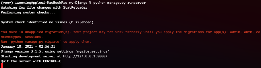 이제 아래 명령어로 장고 프로젝트를 실행해봅시다.