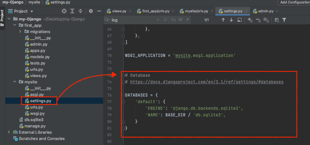 데이터베이스 설정 파일인 mysite/settings.py를 확인해봅니다 :)