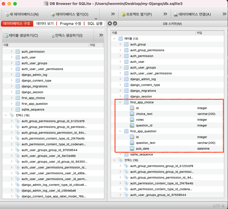 1단계에서 생성한 테이블 그리고 2단계에서 생성한 테이블 (first_app_choice/ first_app_question) 스키마를 확인할 수 있습니다 😁