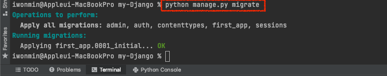 first_app 부분도 데이터베이스 스키마를 생성해줍니다. 여기까지 진행 했을 시 first_app/migrations 폴더에 0001_initial.py가 작성됩니다. 파일을 열어보면 데이터베이스 생성에 필요한 부분이 정의 되어있습니다.