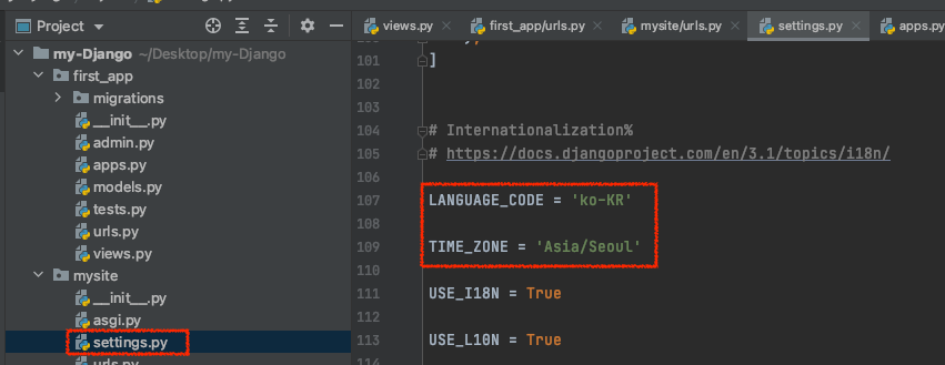 mysite/settings.py파일을 다시 열어준다음, INSTALLED_APPS 에 first_app을 추가합니다.
