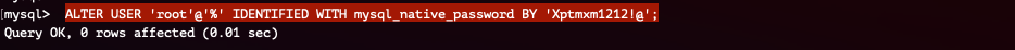 mysql> ALTER USER 'root'@'%' IDENTIFIED WITH mysql_native_password BY 'Xptmxm1212!@';