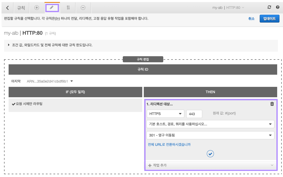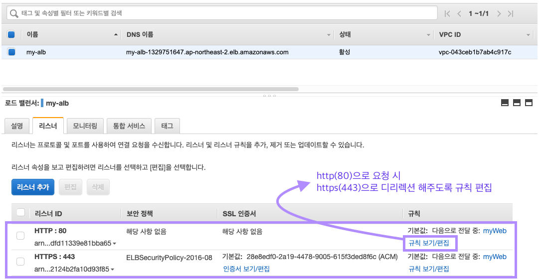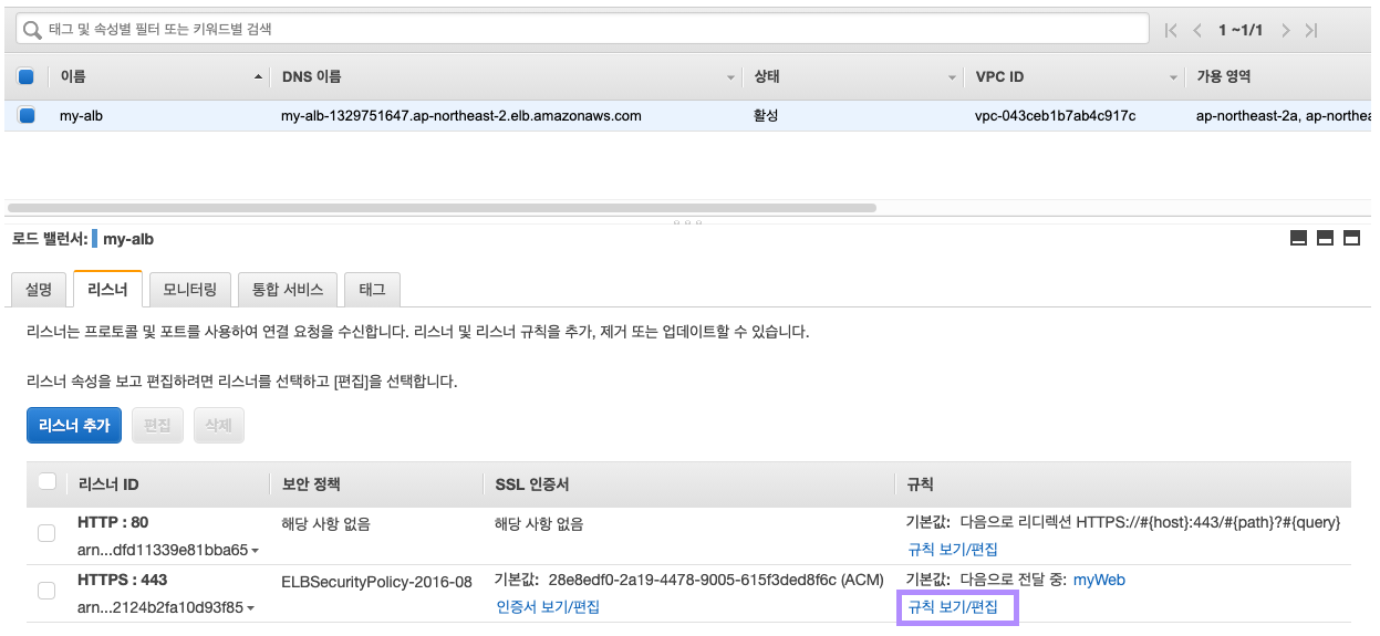 먼저, 리스너 https 443 규칙 편집을 클릭합니다.