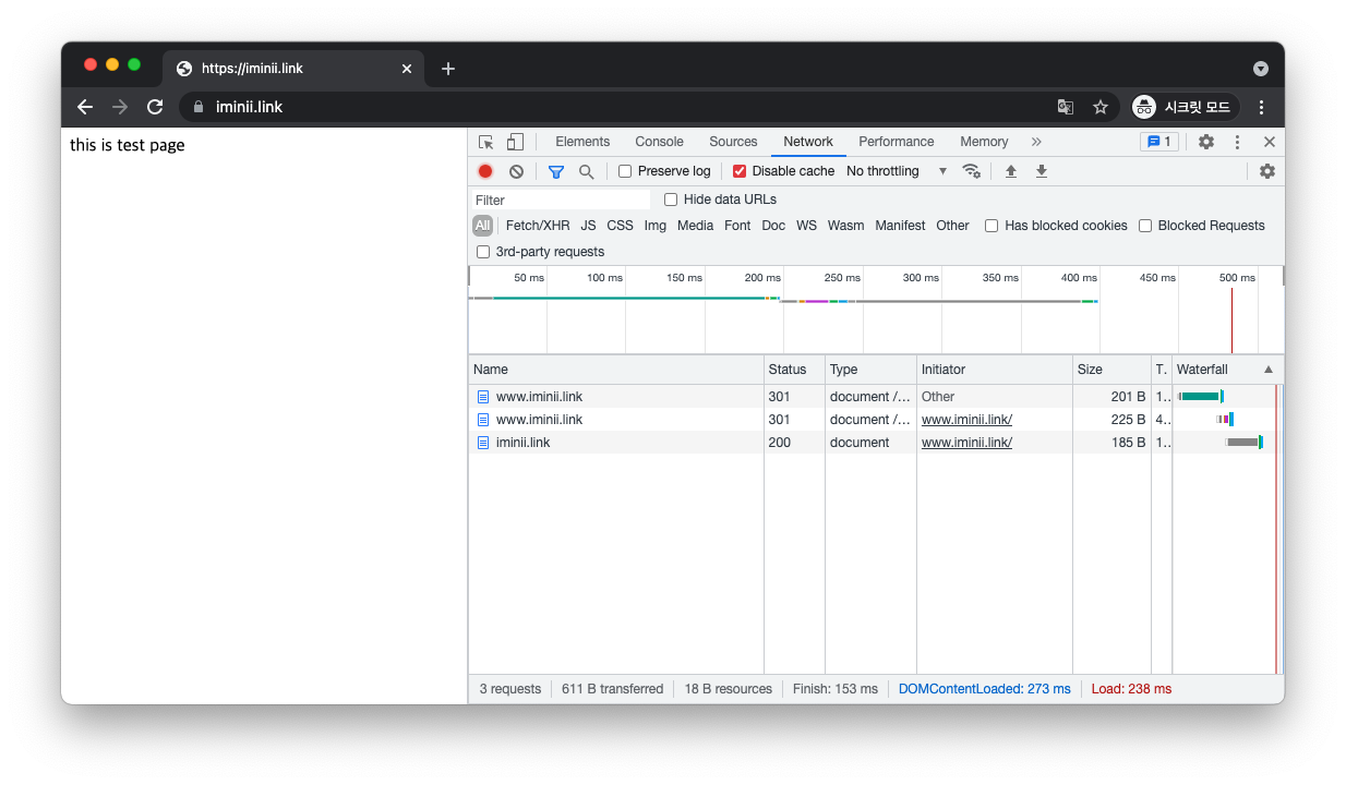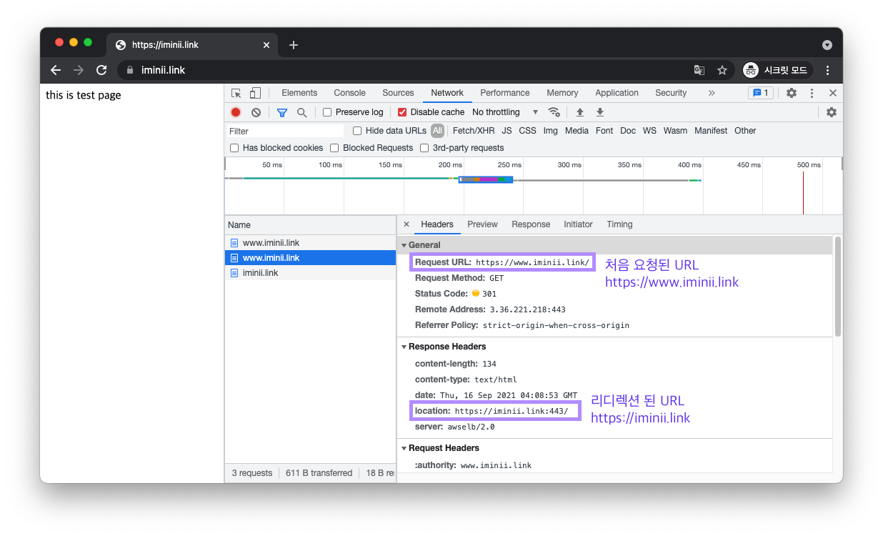 웹브라우저에서 http://www.iminii.link 요청 시 아래 캡쳐와 같이 2번 리디렉션 된 것을 확인할 수 있습니다.