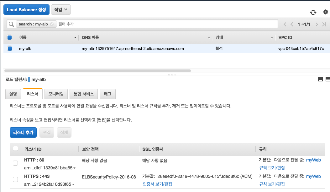 https 443 리스너 설정이 완료 되었다면, 아래와 같이 지정한 타겟그룹으로 변경하도록 되어있을텐데요!