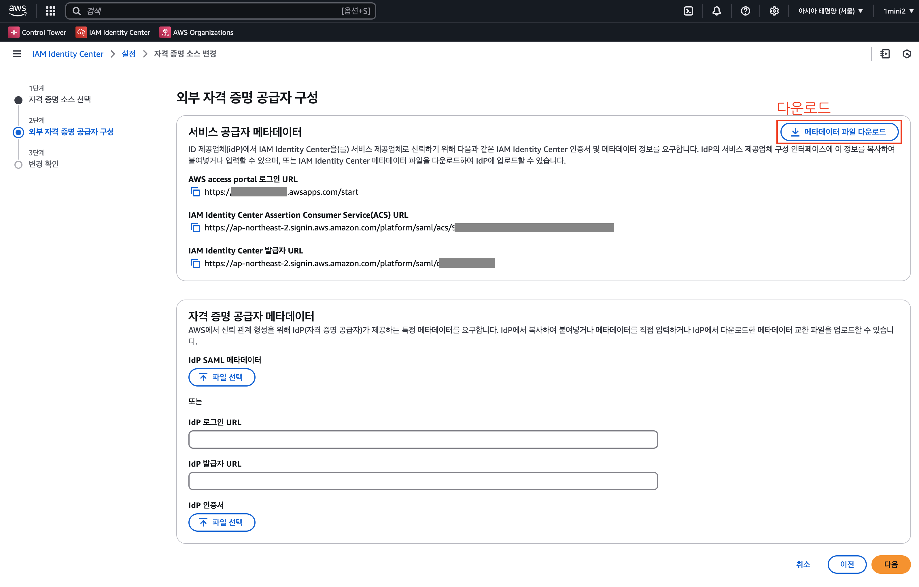 다시 1번에서 설정중이었던 AWS콘솔로 들어가서 방금 다운받은 SAML 2.0 Identity Provider Metadata 파일을 업로드 한다.