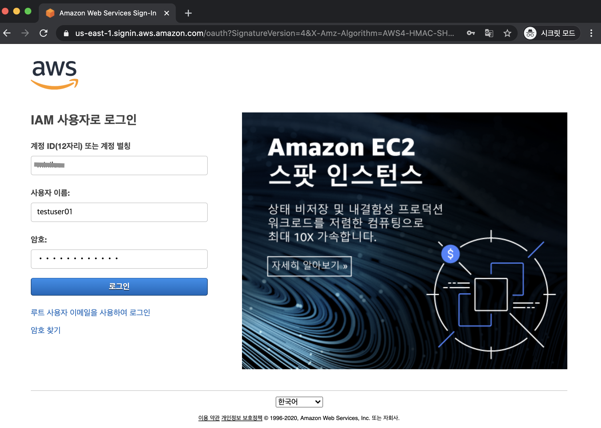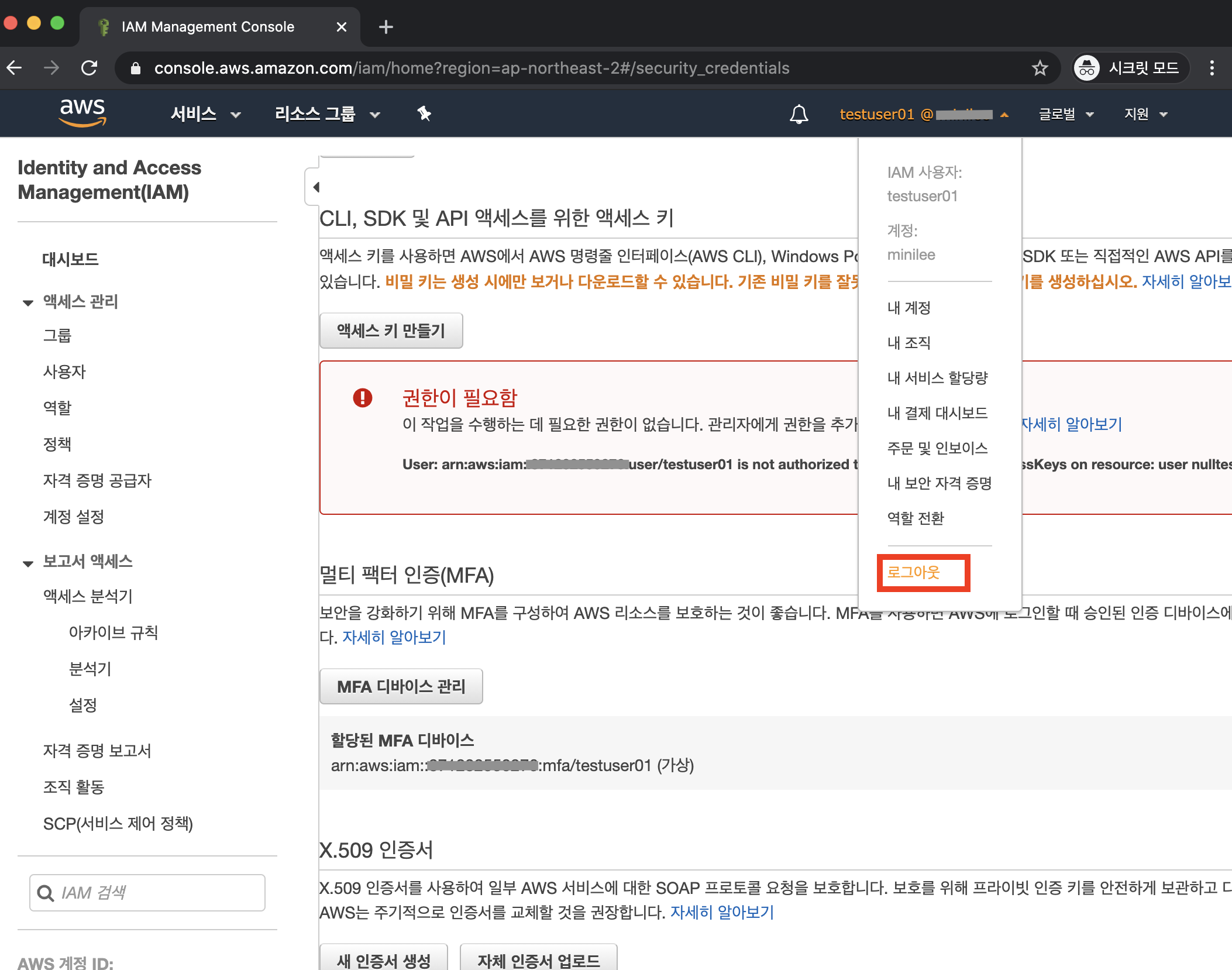 이제 이 그룹에 연결된 사용자는 서울리전과 버지니아 리전에서만 AWS서비스 사용이 가능하며, MFA 2차인증 없이는 콘솔을 사용할 수 없습니다.
