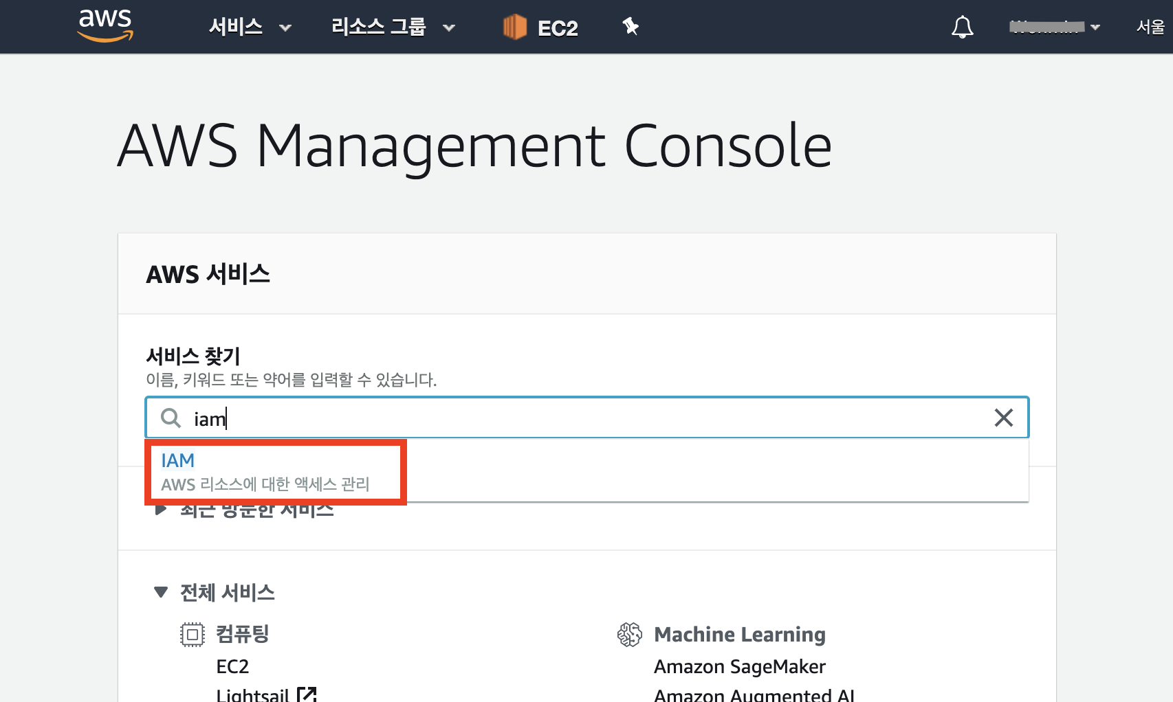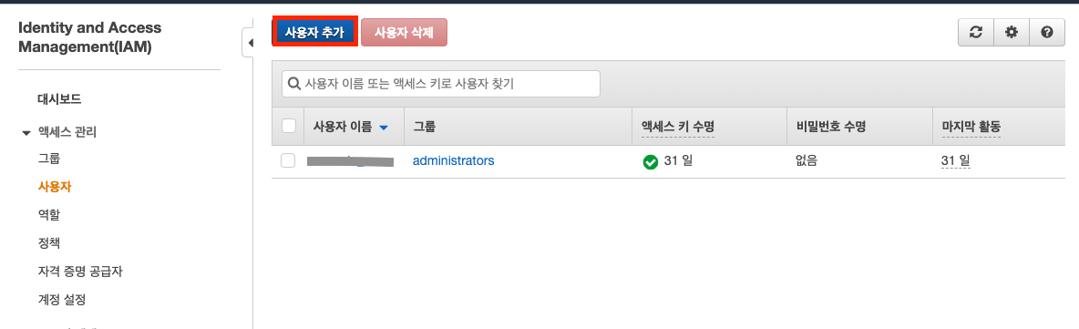 AWS 콘솔에 로그인 한 후, IAM 서비스의 콘솔에 접속합니다.