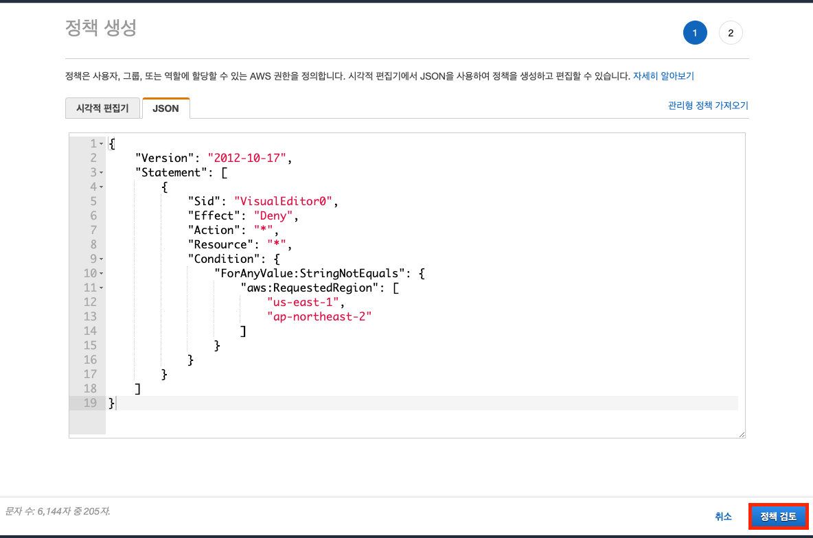 이 정책에서 허용하는 리전은 미국 동부 (버지니아 북부) us-east-1, 아시아 태평양 (서울) ap-northeast-2입니다.