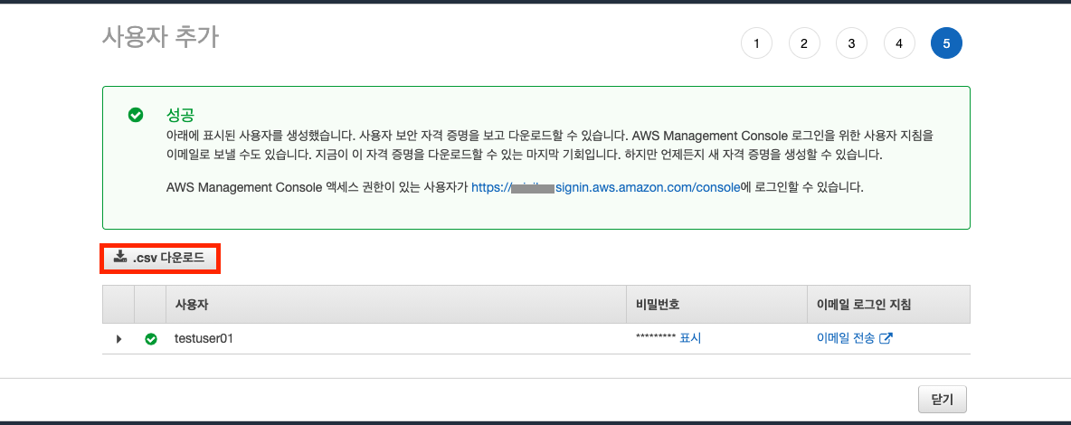 ".csv 다운로드"를 클릭여 사용자 계정정보를 저장합니다.