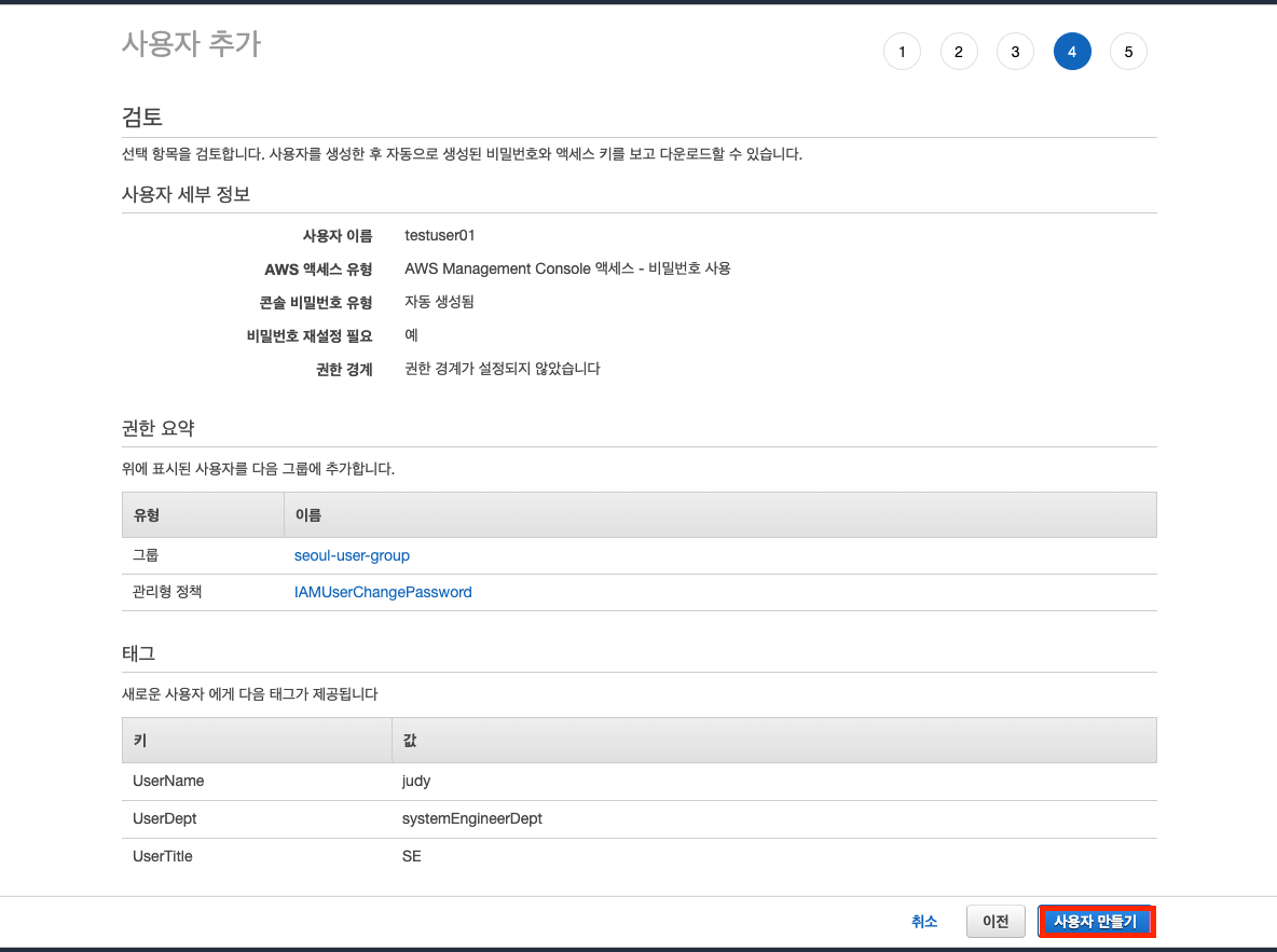 검토페이지에서 사용자 검토한 후 "사용자 만들기"를 클릭합니다.