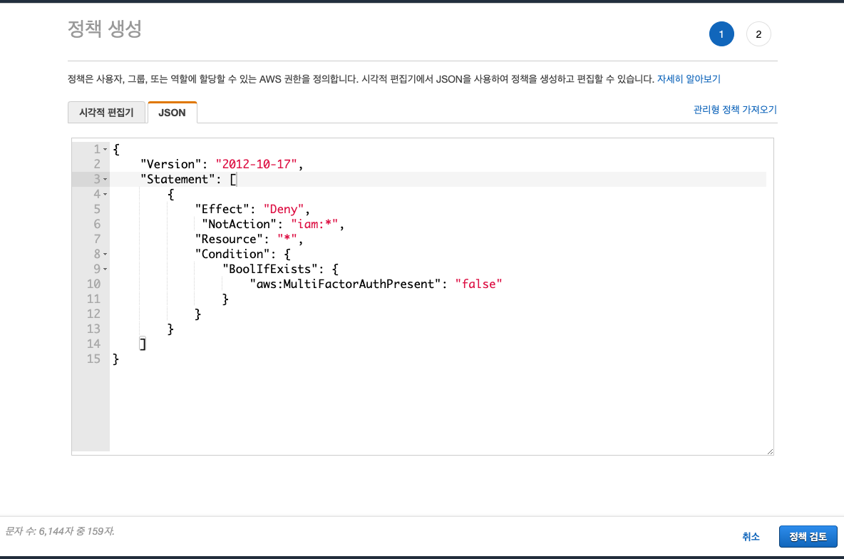 정책 생성 페이지에서 Json 탭을 선택하고 아래의 정책을 넣어줍니다.