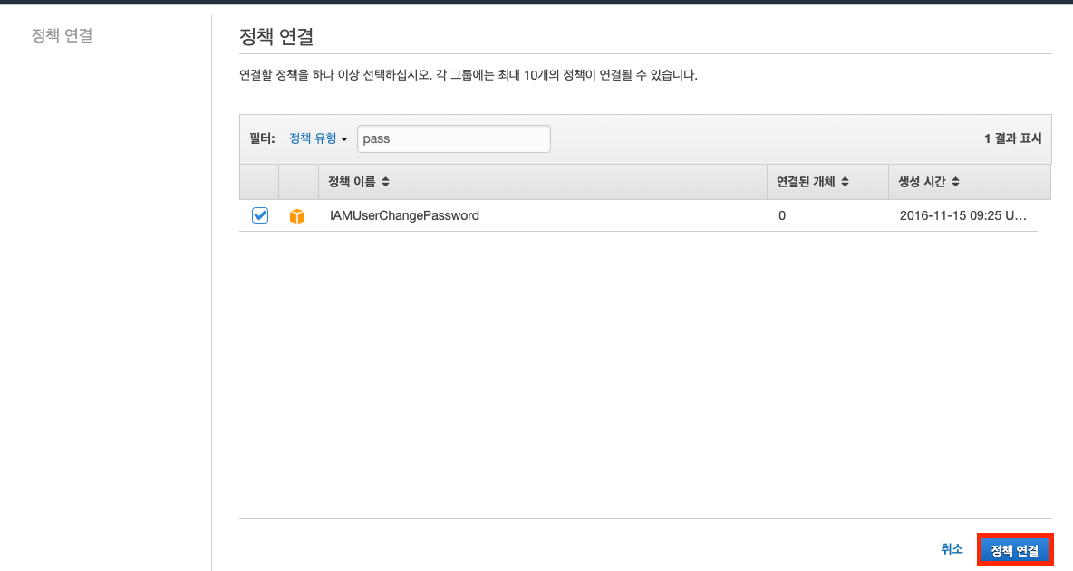 필터에서 pass을 검색하고, IAMUserChangePassword를 연결하고 "정책연결"을 클릭합니다.